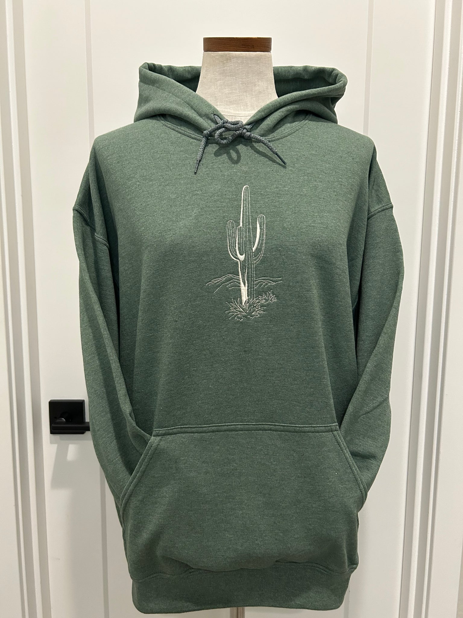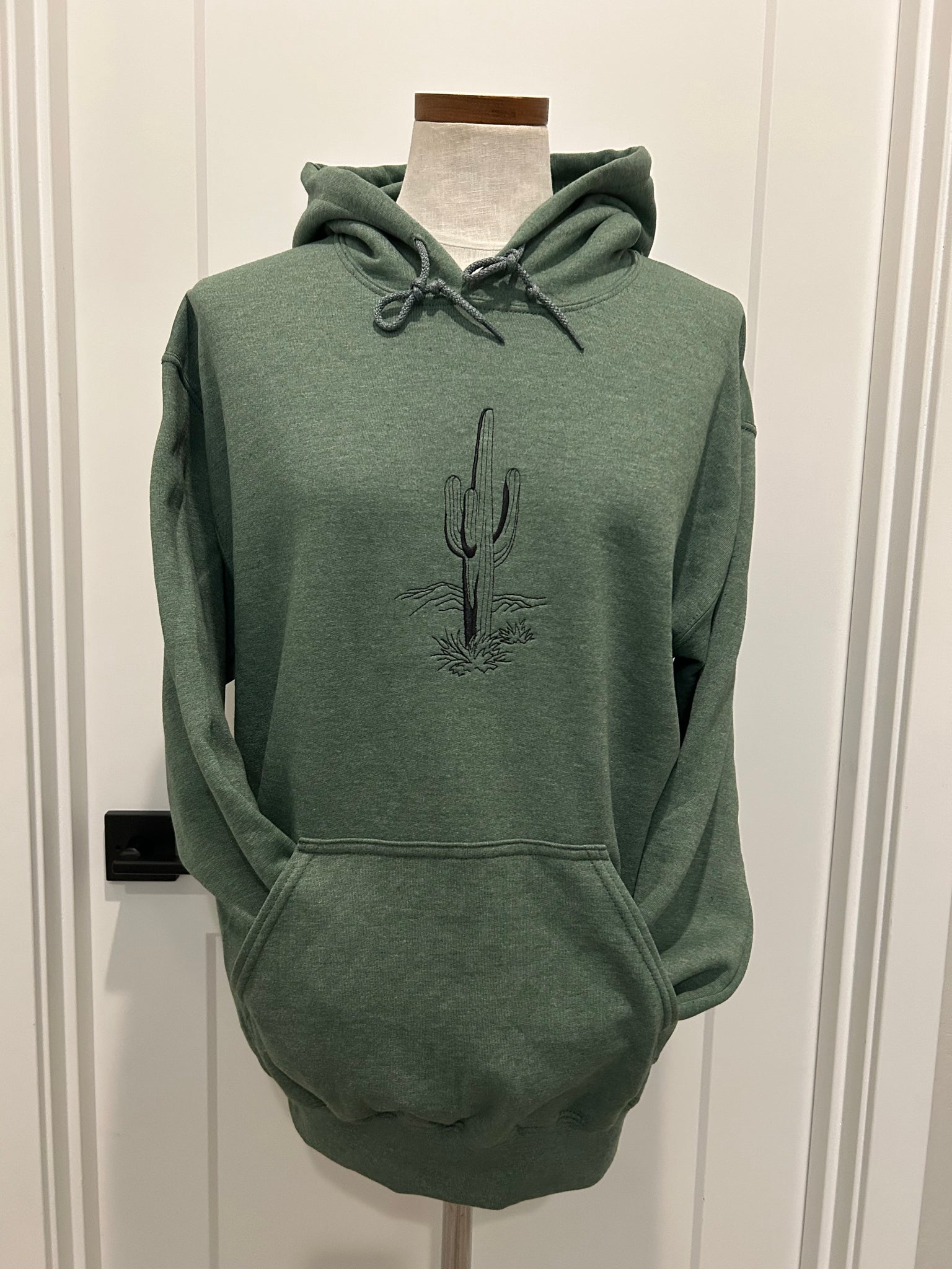 This item is for a heather dark green sweatshirt hoodie with embroidered saguaro cactus. The hoodies are 50% cotton and 50% polyester.